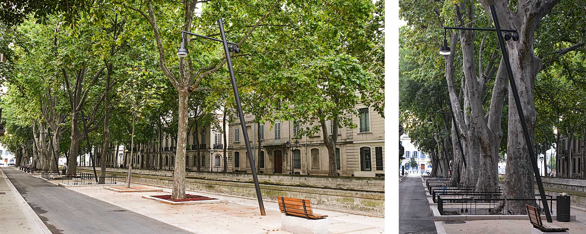 Promenade emblématique à deux pas du cœur de Nîmes, la requalification des Quais de la Fontaine se devait de préserver et valoriser son patrimoine historique exceptionnel. Pari gagné : c’est désormais une voie confortable où les véhicules cohabitent intelligemment avec cyclistes et piétons. Les candélabres Technilum®, déstructurés, jouent avec les perspectives de cet axe aux arbres centenaires.