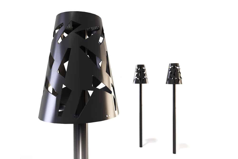 - Cône ajouré en tôle d’aluminium découpée et firmée (base Ø 750mm, tête Ø 415mm, hauteur 1m). Armature constituée d’une embase en fonderie d’aluminium et de 3 montants verticaux en rondin d’aluminium Ø 25 mm.