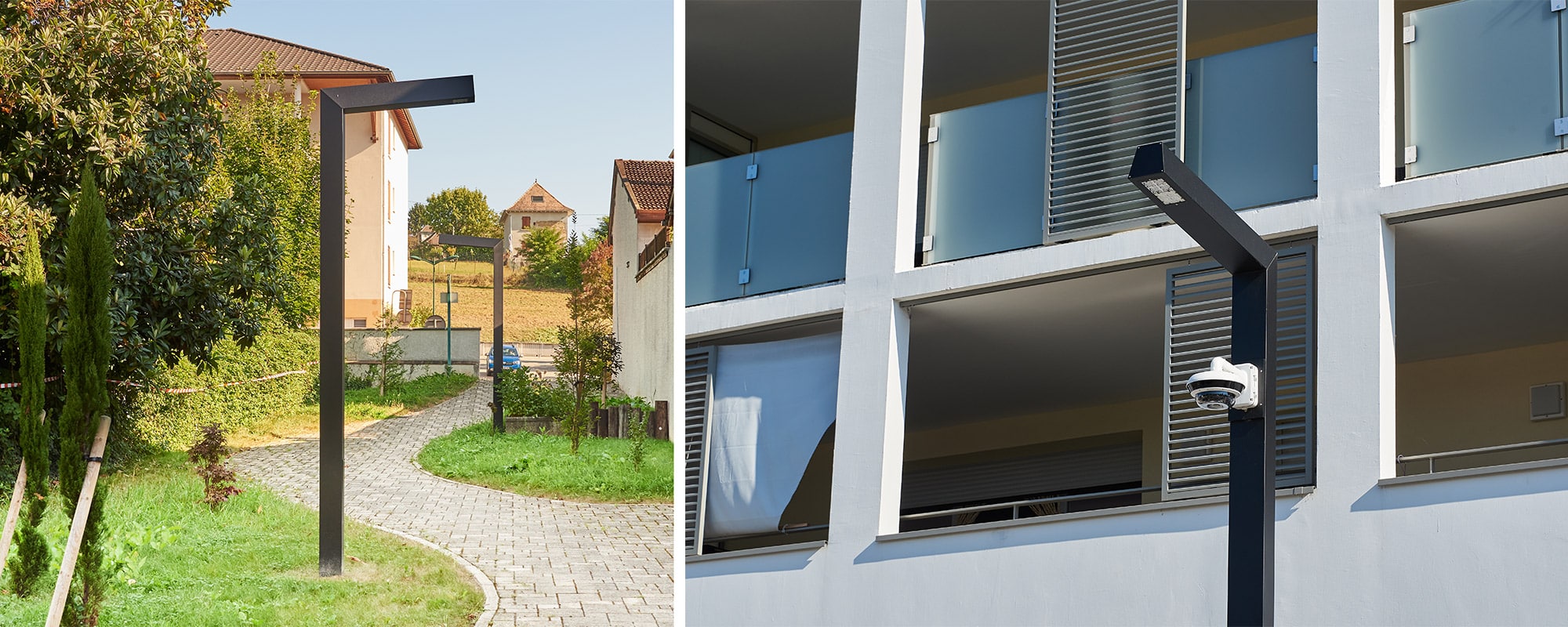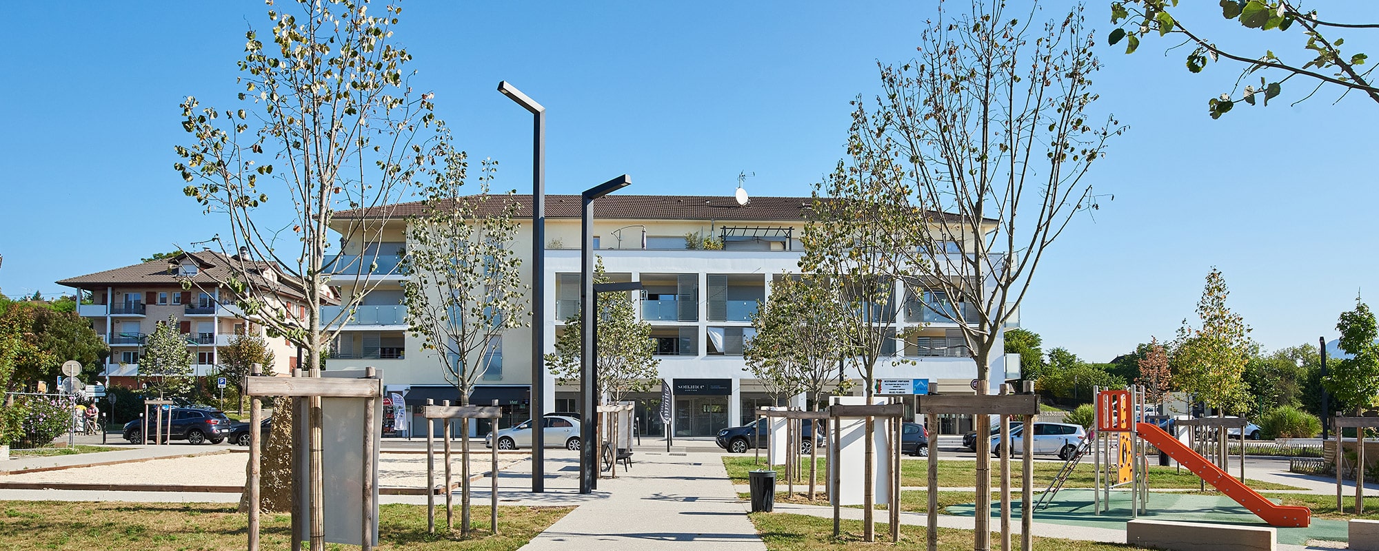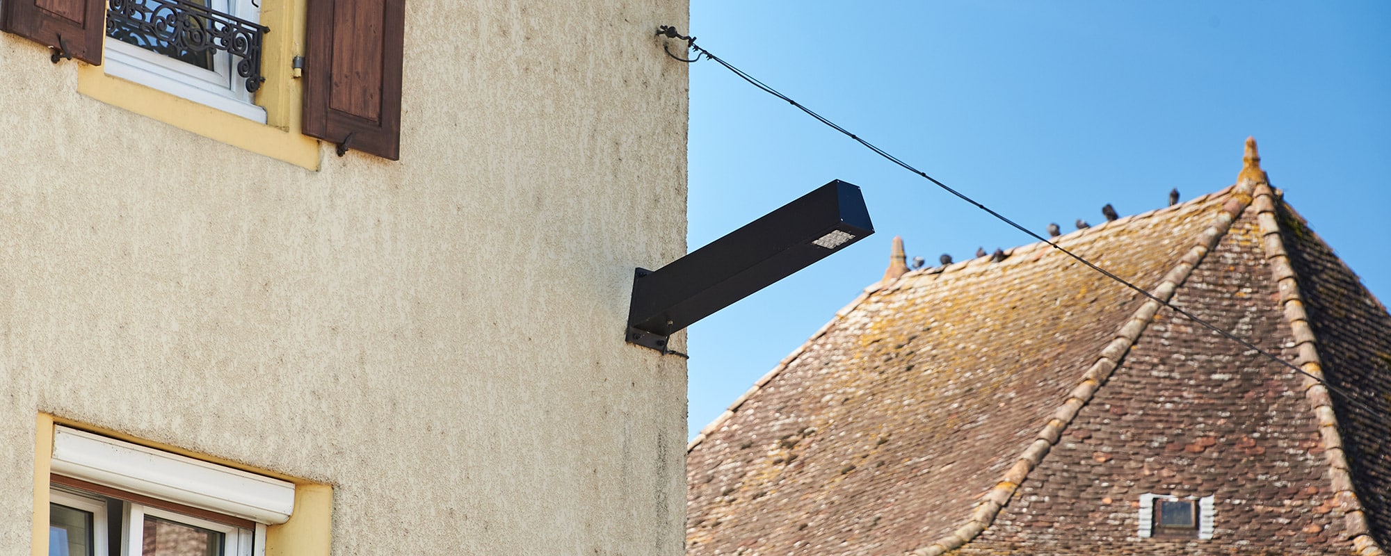 Les rénovations du cœur de ville des Avenières ont transformé la place Bacchus, et ont vu fleurir des appliques et lampadaire Mikado PM, tant en alignement qu’en bouquet.