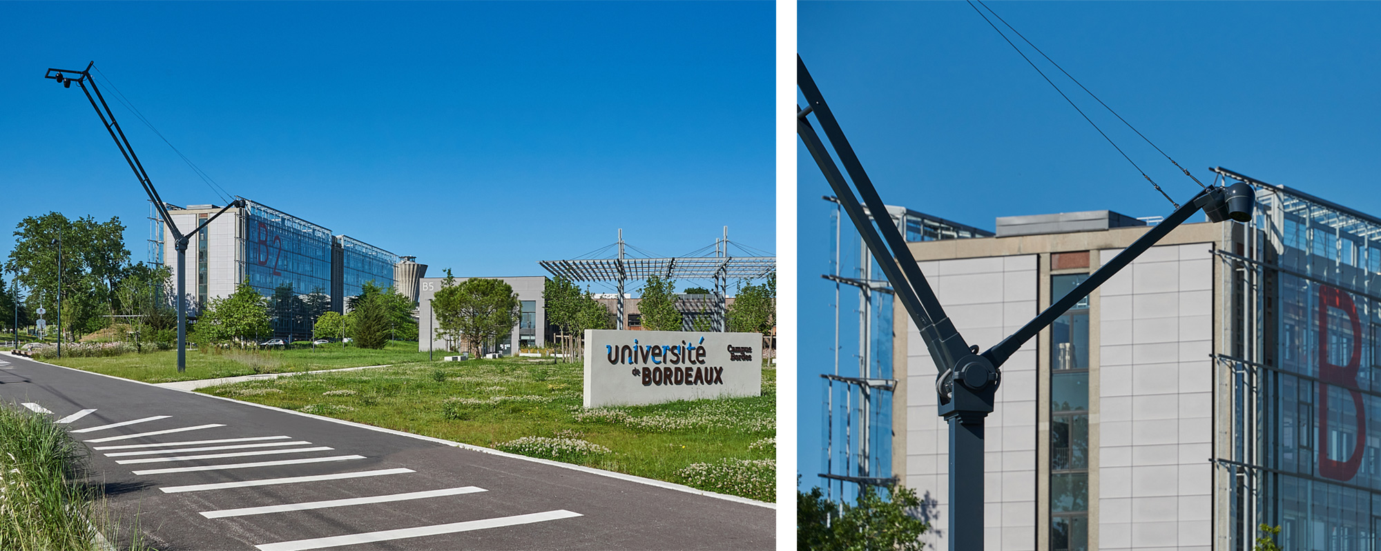 Le Campus François Bordes de Pessac bénéficie désormais d’espaces publics qualitatifs, privilégiant les modes de déplacements doux tel le tramway ou le vélo. Nos mâts support projecteurs Specimen signent ici une réalisation lumineuse de caractère, orchestrée par le concepteur lumière Yon Anton-Olano.
