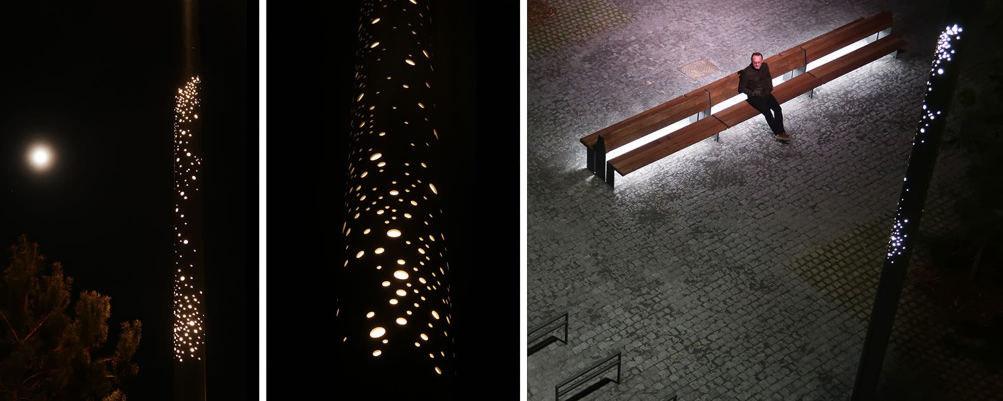 Nouvel espace public majeur au cœur du quartier de l’Ecole polytechnique de Saclay, le Green, espace paysager de 2,5 hectares, est désormais ponctué de nos Structure K Ø250 de 12 m : de grands mâts totem délicatement ajourés, formant une constellation d’étoiles. Un travail de conception lumière (et d’usinage !) tout en délicatesse. Un projet aussi poétique que respectueux de la trame noire des lieux.